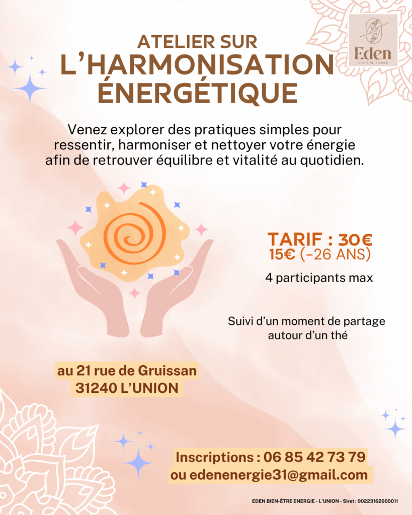 Je vous invite à mon atelier sur l’harmonisation énergétique, moment de bien-être et de partage, où vous apprendrez à ressentir, purifier et élever vos vibrations.